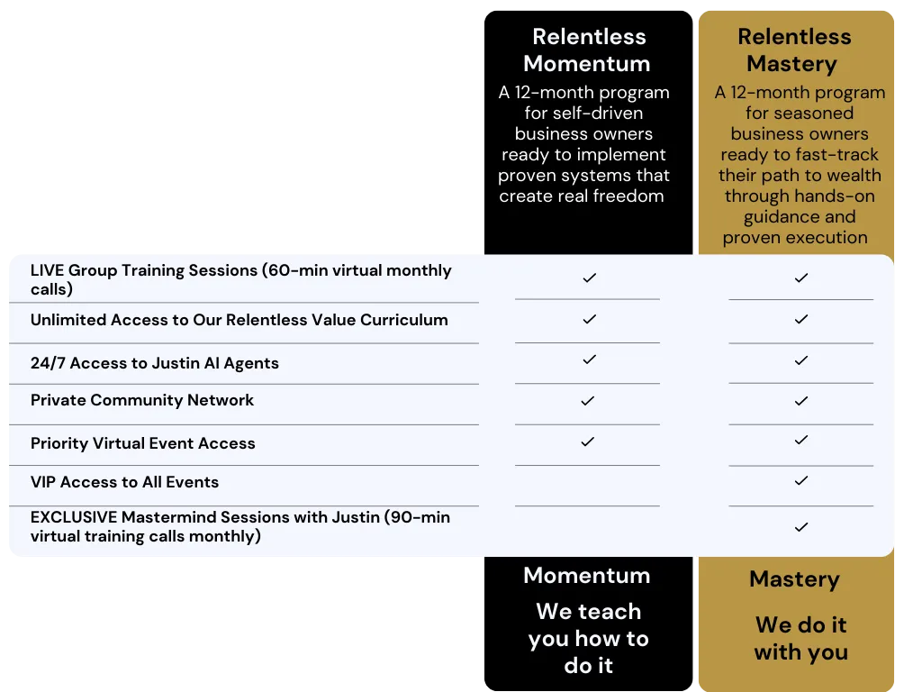 For years, this level of guidance was only available through private coaching at thousands per month. Now, through Relentless Value Coaching, you get access to the same proven strategies and systems that have helped countless business owners break free from the daily grind and build true wealth.